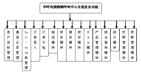 華呼電視購物呼叫中心系統(tǒng)包含客戶資料管理模塊、通話記錄、CALL-BAC單管理模塊、訂單錄入、訂單分檢、物流模塊、財務模塊、媒體模塊、投訴模塊、FAQ模塊、產(chǎn)品管理模塊、綜合查詢模塊、統(tǒng)計模塊、權限管理模塊和參數(shù)管理模塊。其中通話記錄、CALL-BACK單兩個模塊與平臺硬件有緊密的直接的關系,其他模塊相對于平臺硬件更加獨立。并形成以客戶信息為基礎核心,在協(xié)調(diào)各業(yè)務功能關系基礎上構建電視購物業(yè)務信息平臺,以促進業(yè)務規(guī)范、提高話務員工作效率,積累客戶資料。