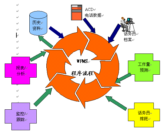 如上面所描述的WFMS流程,最初開始于歷史的電話信息、目前的ACD數(shù)據(jù)和服務(wù)代表的簡介。從這些綜合的信息,做出對工作量的預(yù)測,從而從本質(zhì)上決定了配備給呼叫中心的服務(wù)代表數(shù)量。了解了服務(wù)代表的需求數(shù)量,一個適用于任何時間段的工作時間表就可以產(chǎn)生了,包括每天的,每周的,每月的。基于這一點,主管人就可以監(jiān)控服務(wù)代表的行為,追蹤來電,并分析不同種類的來電分組,做出應(yīng)對假定情景的方案,從而產(chǎn)生各種各樣的報告和圖表。