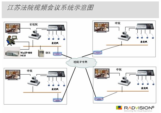 RADVISION為江蘇法院建立的視頻會議系統(tǒng)解決方案配備1臺RADVISION ViaIP400 MCU,建設(shè)容量為13點的2M會議,系統(tǒng)支持不同需求的會議模式,包括研討型會議、遠程法庭、遠程審判、大型講演型會議和培訓(xùn)等,會議資源由江蘇法院集中控制和調(diào)度。在安全性、技術(shù)先進性、可擴展性、易操作性和經(jīng)濟性等方面,RADVISION視頻會議系統(tǒng)都做了充分的考量。