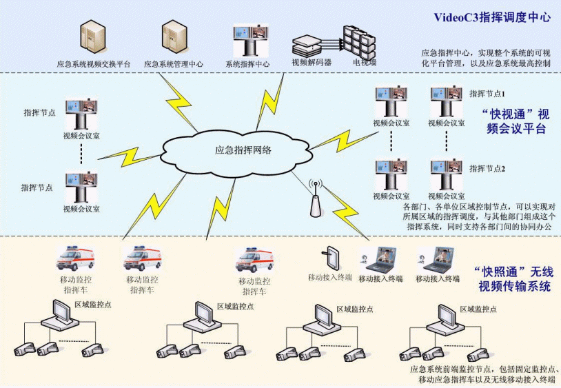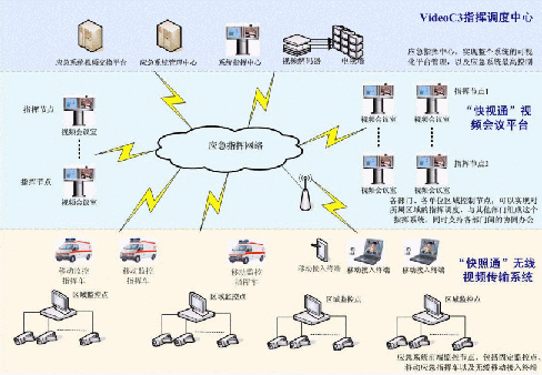 C3I視頻應(yīng)急指揮協(xié)同系統(tǒng)在政府IP網(wǎng)絡(luò)中處于城市的神經(jīng)中樞。它將政府各個(gè)部門、單位聯(lián)系成為一個(gè)整體。在C3I視頻應(yīng)急指揮協(xié)同系統(tǒng)的前端,由"快照通"無(wú)線視頻傳輸系統(tǒng)對(duì)政府所屬各個(gè)單位進(jìn)行實(shí)時(shí)監(jiān)控,時(shí)刻掌握現(xiàn)場(chǎng)動(dòng)態(tài),該部分支持固定點(diǎn)監(jiān)控,也支持移動(dòng)指揮點(diǎn)和無(wú)線移動(dòng)接入終端,保證了前方工作的靈活、機(jī)動(dòng)性;在系統(tǒng)的指揮中心部分,由VideoC3指揮調(diào)度中心來(lái)支持,它一方面需要對(duì)前端的監(jiān)控信息進(jìn)行控制,同時(shí),要對(duì)整個(gè)政府進(jìn)行綜合管理調(diào)度,在發(fā)生突發(fā)狀態(tài)的時(shí)刻,現(xiàn)場(chǎng)前端"快照通"捕獲的相應(yīng)信息通過(guò)C3I系統(tǒng)平臺(tái),迅速傳遞至指揮中心部分,政府管理人員通過(guò)VideoC3指揮調(diào)度中心對(duì)前端進(jìn)行遠(yuǎn)程指揮,在第一時(shí)間緊急處理現(xiàn)場(chǎng)突發(fā)事件;在整個(gè)C3I系統(tǒng)中,政府各個(gè)部門、單位之間通過(guò)"快視通"視頻會(huì)議平臺(tái)進(jìn)行辦公交流,支持各部門間的協(xié)同辦公,同時(shí),也可以通過(guò)其實(shí)現(xiàn)對(duì)所屬區(qū)域的指揮調(diào)度。