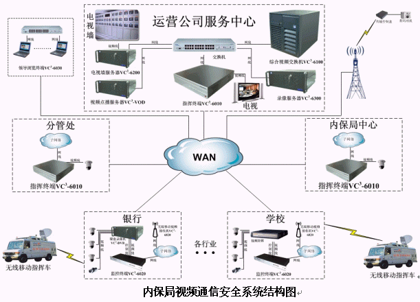 針對(duì)以上情況,北京華緯訊電信技術(shù)有限公司基于最新推出的VC3-6000綜合視頻通信平臺(tái)提出了針對(duì)性的"城市安保聯(lián)動(dòng)視頻通信平臺(tái)"解決方案。該平臺(tái)整合多種資源,實(shí)現(xiàn)了視頻指揮調(diào)度、遠(yuǎn)程視頻監(jiān)控、視頻會(huì)議、視頻點(diǎn)播、無線移動(dòng)視頻接入、高清晰圖片傳輸和環(huán)境監(jiān)測(cè)等功能。平臺(tái)組成如下圖: