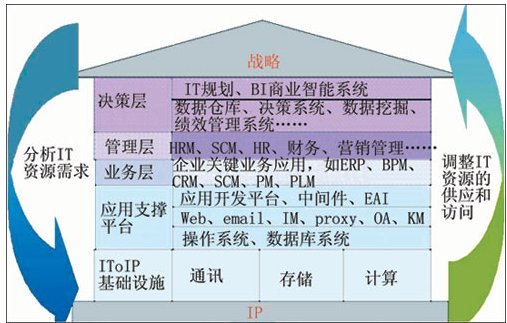 按照華為3Com的構(gòu)想,如果把整個(gè)IT系統(tǒng)比做一座房屋,那么整個(gè)房屋的地基就是IP網(wǎng)絡(luò),需要基于IP網(wǎng)絡(luò)來(lái)構(gòu)建通信、存儲(chǔ)、計(jì)算等IT基礎(chǔ)設(shè)施。在這些基礎(chǔ)設(shè)施之上,則是應(yīng)用支撐平臺(tái)(操作系統(tǒng)、數(shù)據(jù)庫(kù)系統(tǒng)、應(yīng)用開發(fā)平臺(tái)等),基于應(yīng)用支撐平臺(tái)提供給機(jī)構(gòu)的關(guān)鍵業(yè)務(wù)流程信息系統(tǒng)(如ERP、SCM等),最終為用戶的管理和決策提供支持。“在戰(zhàn)略與IT基礎(chǔ)設(shè)施之間實(shí)現(xiàn)實(shí)時(shí)同步互動(dòng),IT為用戶高層提供商業(yè)智能系統(tǒng)、決策系統(tǒng),以便決策層即時(shí)掌握信息,作為機(jī)構(gòu)戰(zhàn)略決策、戰(zhàn)略挑戰(zhàn)的依據(jù);用戶可以依據(jù)內(nèi)、外部變化,進(jìn)行戰(zhàn)略調(diào)整時(shí)快速分析新的IT資源需求,同步調(diào)整IT資源的配置,從而使IT與業(yè)務(wù)戰(zhàn)略保持同步。”這正是IToIP的基本理念。