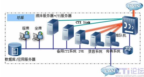 北京為總部中心,將部署CTI服務(wù)器、IVR服務(wù)器、錄音系統(tǒng)、傳真系統(tǒng)、文件服務(wù)器及相關(guān)業(yè)務(wù)數(shù)據(jù)庫服務(wù)器,為各個營業(yè)網(wǎng)點提供業(yè)務(wù)支撐。總部將對整個網(wǎng)絡(luò)進(jìn)行管理,包括平臺配置、業(yè)務(wù)管理、數(shù)據(jù)管理、人員調(diào)度等。在總部CTI系統(tǒng)我們采用主備模式,確保了在出現(xiàn)網(wǎng)絡(luò)故障主CTI系統(tǒng)無法提供服務(wù)情況下,備用CTI系統(tǒng)將接替主CTI系統(tǒng)工作,確保了整個系統(tǒng)的正常工作。硬件平臺方面,UAP我們采用了雙主控板雙電源供電工作模式,這對系統(tǒng)長期穩(wěn)定工作提供了保障。總部同時也部署北京農(nóng)村商業(yè)銀行300個坐席人員,這些坐席人員可以按照業(yè)務(wù)進(jìn)行區(qū)分,大部分坐席精通一般的業(yè)務(wù),為普通客戶提供優(yōu)質(zhì)服務(wù),少部分坐席(專業(yè)坐席)人員為高價值客戶提供高級的專業(yè)的優(yōu)質(zhì)服務(wù),在普通坐席比較忙時,專業(yè)坐席可以為普通用戶提供服務(wù),坐席中,還有極少部分可以充當(dāng)坐席管理員角色,他們也可以監(jiān)控各個分中心坐席服務(wù)的質(zhì)量,對有問題服務(wù)可以實現(xiàn)監(jiān)聽、監(jiān)察、和強(qiáng)拆功能,及時的保證服務(wù)質(zhì)量,維護(hù)了企業(yè)形象。