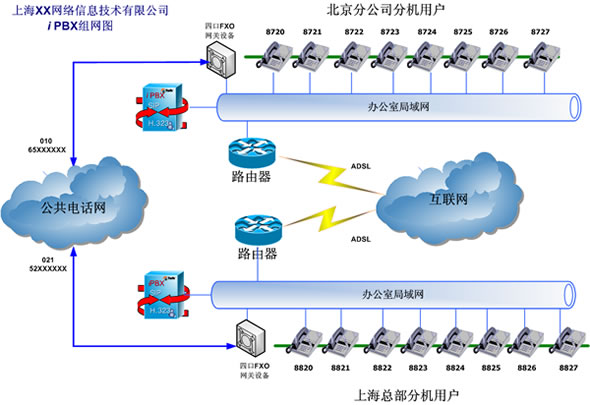 根據(jù)該用戶解決內(nèi)部通訊費用的要求,在北京和上海兩個iPBX系統(tǒng)之間實現(xiàn)互通。兩套iPBX的外線通過普通模擬網(wǎng)關(guān)的FXO口與現(xiàn)存的PSTN線連接。