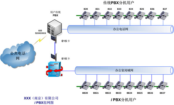 該用戶購買eTalk iPBX系統(tǒng)一套,設(shè)置于其所屬開發(fā)中心機(jī)房,利用現(xiàn)存辦公室局域網(wǎng)布設(shè)分機(jī)。通過E1板卡與原有傳統(tǒng)PBX連接,實現(xiàn)與傳統(tǒng)PBX分機(jī)用戶之間的互相撥打。傳統(tǒng)PBX分機(jī)用戶同時也能享受eTalk