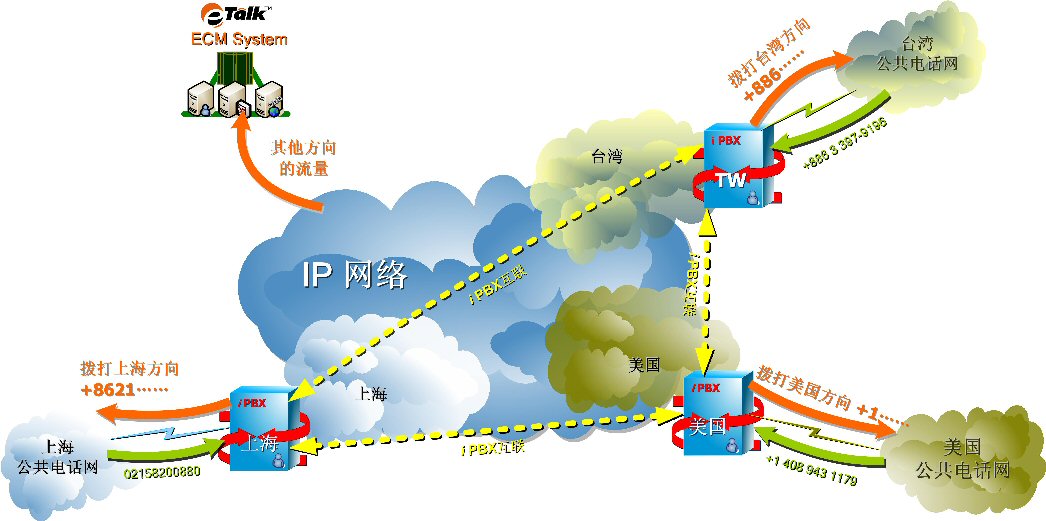 eTalk® iPBX可同時或者分別接受來自一個或者多個傳統(tǒng)電信運(yùn)營商和虛擬運(yùn)營商提供的語音服務(wù)。甚至可以在多臺i PBX之間實(shí)現(xiàn)零成本互通,合理利用各地PSTN資源,以降低企業(yè)通訊成本。