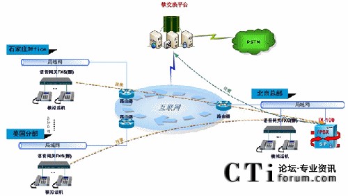 在石家莊,也安裝1臺48FXS語音網(wǎng)關(guān),該網(wǎng)關(guān)可接48部模擬話機,通過公網(wǎng)直接注冊至總部的IX-100,作為公司的遠程分機,享受功能和總部的分機完全相同,做到移地仿真的虛擬統(tǒng)一。