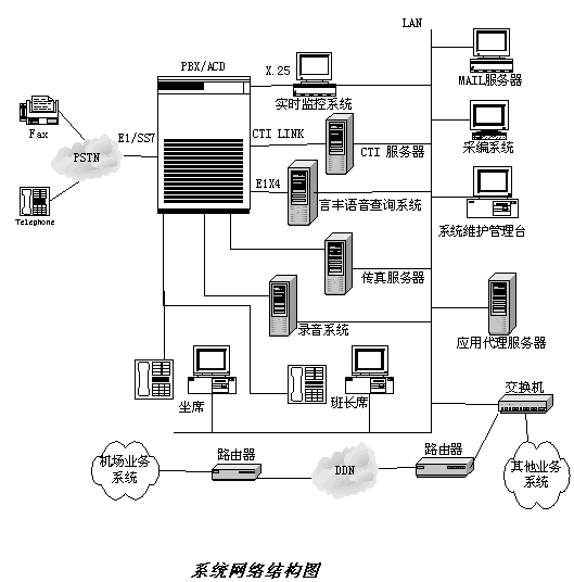本系統(tǒng)采用E1數(shù)字中繼線接入電話網(wǎng),成為能夠在聲訊臺或機場獨立運行的系統(tǒng)。