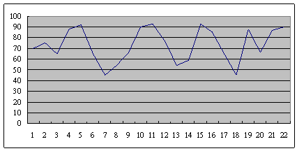 底下這是某呼叫中心從早上8點(diǎn)開始,一直到晚上6點(diǎn),每隔半個(gè)小時(shí)的服務(wù)水平。可以很清楚的看到,服務(wù)水平在91到48這中間震蕩,平均服務(wù)水平是73左右。