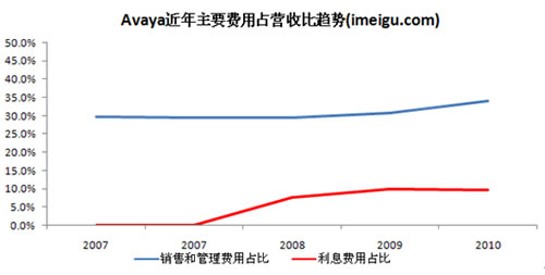 銷售和管理費用以及利息費用是Avaya開支最大的兩塊費用,管理和銷售費用一直穩(wěn)定在30%左右。Avaya私有化之前的2006、2007財年的利息費用分別為300萬美元、100萬美元(對應著51.48億美元和52,78億美元的營收),利息費用占比不到1%,私有化之后利息費用急劇飆升(私有化相關(guān)債務的增加),2008、2009、2010財年利息費用分別為3.77億美元、4.09億美元、4.87億美元,成為束縛Avaya盈利的關(guān)鍵因素。