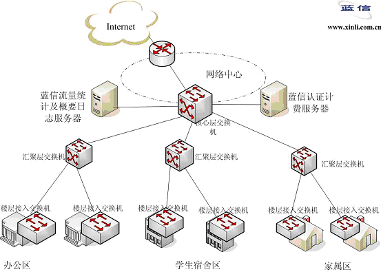 在網(wǎng)絡(luò)中心機(jī)房部署“藍(lán)信認(rèn)證計(jì)費(fèi)系統(tǒng)”,藍(lán)信認(rèn)證計(jì)費(fèi)系統(tǒng)除支持標(biāo)準(zhǔn)的RADIUS協(xié)議外,還支持領(lǐng)先的802.1x協(xié)議,通過與各接入層交換機(jī)的配合,實(shí)現(xiàn)了認(rèn)證管理功能。通過綁定帳號(hào)、IP、MAC地址等15元素,真正保證只有合法用戶才能通過認(rèn)證;對(duì)用戶進(jìn)行分級(jí)權(quán)限管理,可按信用度等級(jí)對(duì)用戶進(jìn)行劃分,方便了用戶的管理。此外,在網(wǎng)絡(luò)出口處部署藍(lán)信流量統(tǒng)計(jì)工具,通過與藍(lán)信認(rèn)證計(jì)費(fèi)系統(tǒng)的配合,實(shí)現(xiàn)對(duì)用戶按流量來計(jì)費(fèi),可以把用戶訪問流量按校內(nèi)校外、國內(nèi)國際來區(qū)別對(duì)待,并設(shè)置不同的費(fèi)率。同時(shí),還部署了藍(lán)信概要日志系統(tǒng),有效記錄了用戶的上網(wǎng)信息,并提供人性化的web客戶端,方便管理者進(jìn)行事后查詢,有效的控制了網(wǎng)絡(luò)的安全性。