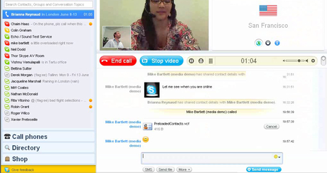 顯著的一個(gè)大改變是,軟件界面變成了全屏,而視頻窗口又占據(jù)了絕大部分版面。在視頻中還有“畫中畫”的功能,小的畫面可以任意移動(dòng)?梢哉f(shuō)skype從一部網(wǎng)絡(luò)電話,變成了一部網(wǎng)絡(luò)可視電話。或者,好像感覺(jué)是在視頻聊天室中一樣。