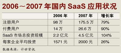 SaaS在中國正步入一個快速發(fā)展的時期。計(jì)世資訊調(diào)查數(shù)據(jù)顯示,2007年國內(nèi)SaaS市場在諸多積極因素的刺激下快速發(fā)展,用戶的投資額度和付費(fèi)用戶數(shù)快速增長,使得企業(yè)用戶在在線管理服務(wù)的投入上有較快的增長。2007年企業(yè)用戶在SaaS上的平均投資額度比2006年增長了約26%。2007年管理型SaaS應(yīng)用的總投資規(guī)模為4.5億元,但與2007年管理軟件市場整體規(guī)模248億元比,目前在線管理服務(wù)市場規(guī)模仍然相當(dāng)小。