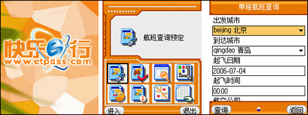 “快樂e行”預(yù)裝在手機(jī)中的存儲卡中,可直接安裝到手機(jī)的應(yīng)用菜單欄里,點擊圖標(biāo),就可以直接進(jìn)入首頁。圖形化的操作按鍵、簡明的文字提示、順暢的操作流程,人性化的設(shè)計讓機(jī)票預(yù)訂變得不再麻煩。