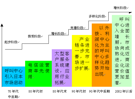 日本市場(chǎng)是全球較為成熟的呼叫中心市場(chǎng)之一,呼叫中心的應(yīng)用遍布各行各業(yè)。在整體呼叫中心行業(yè)產(chǎn)生的市場(chǎng)價(jià)值中,由呼叫中心外撥直接產(chǎn)生的占1/4強(qiáng),50%的呼叫中心配備了專用外撥設(shè)備。這說明呼叫中心已完全脫離了服務(wù)窗口的概念,成為了企業(yè)營銷的有力工具,呼叫中心已高度利潤中心化。