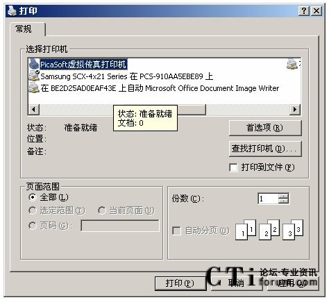發(fā)送傳真配合PCS的虛擬打印軟件,打開(kāi)一個(gè)文本,或者DOC文件,CTRL+P,選擇“PicaSoft虛擬傳真打印機(jī)”,如下圖: