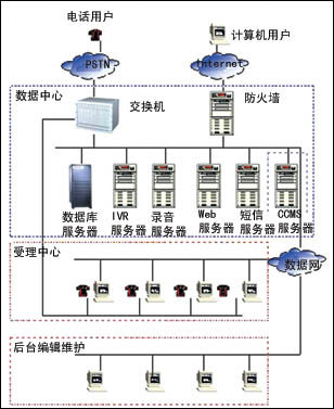 系統(tǒng)的體系結(jié)構(gòu),主要包括三個部分:數(shù)據(jù)中心、受理中心和維護(hù)中心。受理中心與數(shù)據(jù)中心之間采用E1連接,具有2M的數(shù)據(jù)通信能力;維護(hù)中心與數(shù)據(jù)中心之間采用64K DDN線路連接,三個中心分布在三個不同的地方。目前受理中心負(fù)責(zé)全省的所有業(yè)務(wù),客戶通過本地市話經(jīng)由移動電信網(wǎng)絡(luò)將話路指向受理中心,通過數(shù)據(jù)中心的具有排隊功能的交換機(jī),根據(jù)被叫號碼和客戶服務(wù)要求,將講話路轉(zhuǎn)接到自動臺或人工臺席,為客戶提供服務(wù)。當(dāng)用戶呼叫信息臺電話后,進(jìn)入到交換機(jī),交換機(jī)將來話消息通知驅(qū)動池,驅(qū)動池將相關(guān)消息轉(zhuǎn)換為標(biāo)準(zhǔn)格式,通知CCMS,CCMS根據(jù)來話被叫號,根據(jù)管理系統(tǒng)的定義,啟動相應(yīng)的IVR腳本,交給IVR解釋器解釋并由IVR服務(wù)器執(zhí)行,當(dāng)服務(wù)為自動臺完成時,由IVR服務(wù)器實現(xiàn)(如:語音引導(dǎo)、適合自動服務(wù)的內(nèi)容等);當(dāng)用戶需要人工服務(wù)時,CCMS管理系統(tǒng),根據(jù)用戶的服務(wù)要求,按照話路分配原則(通過管理系統(tǒng)定義),選擇最合適的話務(wù)員為其服務(wù),同時CCMS管理系統(tǒng)會將相關(guān)的頁面在話務(wù)員的臺席上顯示出來,同時顯示主叫號碼以及來話標(biāo)示,當(dāng)話務(wù)員應(yīng)答后,即可開始受理,受理的內(nèi)容通過Web服務(wù)器完成,同時對于需要查詢數(shù)據(jù)庫的訪問,通過應(yīng)用服務(wù)器,進(jìn)行數(shù)據(jù)訪問,并返回結(jié)果。當(dāng)服務(wù)完畢,本次呼叫即結(jié)束。