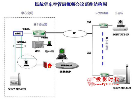 為了建成“具有華東特色,符合總局要求”的視頻會議系統(tǒng),空管局領(lǐng)導(dǎo)經(jīng)過嚴(yán)格的考察和甄選后,最后采用了Sony的視頻會議系統(tǒng)解決方案,包括5臺PCS-G70和10臺PCS-1P。整個項目運(yùn)行在民航數(shù)據(jù)網(wǎng)(ATM網(wǎng))的環(huán)境下,共有24個節(jié)點,設(shè)備分布呈星型結(jié)構(gòu)。