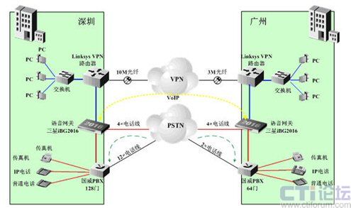 A公司總部設(shè)在深圳,在廣州有分公司。深圳總部目前已有10M光纖到樓作為總出口帶寬,已安裝1臺支持VPN功能的Linksys路由器;語音方面,已申請了16條電話線,并安裝1臺國威128門PBX;廣州也引入了3M光纖作為出口帶寬,和6條電話線作為PSTN外線,已安裝1臺支持VPN功能的Linksys路由器和1臺國威64門PBX。深圳、廣州兩地公司已建立了VPN隧道,以提供有安全保障的數(shù)據(jù)網(wǎng)絡平臺。