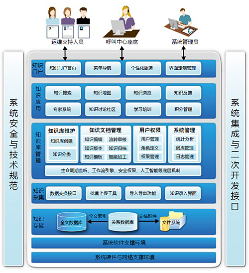 根據(jù)金融業(yè)用戶的需求,TRS運(yùn)維知識管理平臺功能框架自下而上可分為知識存儲、知識采集、知識庫管理、知識應(yīng)用、知識門戶五大功能層,完全覆蓋用戶提出的所有功能需求。并且充分考慮系統(tǒng)安全,遵循技術(shù)規(guī)范,提供對外集成以及二次開發(fā)的接口與服務(wù)。
