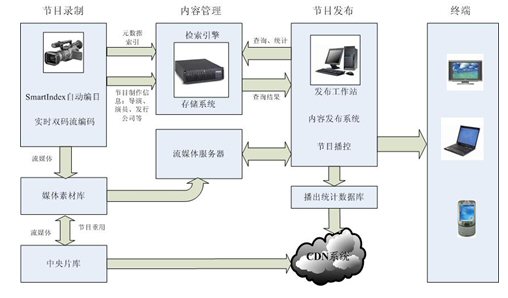 節(jié)目制作平臺主要負責節(jié)目的采編,接收節(jié)目源的數(shù)字視頻信號和模擬視頻信號進行實時/超實時的轉(zhuǎn)碼,并同時進行自動編目、歸檔,滿足系統(tǒng)不同應用的要求。另外,各資源建設成員單位或各地、州、市遠程辦按照省遠程辦的統(tǒng)一部署,加工各自類別的課件,采用人工傳送介質(zhì)或利用VPN實現(xiàn)專網(wǎng)的方式送交到資源庫系統(tǒng)中,實施統(tǒng)一的存儲和管理。
