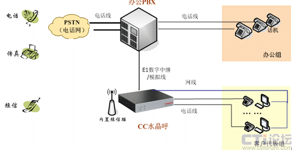 CC水晶呼單獨(dú)組網(wǎng),對(duì)外接運(yùn)營(yíng)商的電話線,對(duì)內(nèi)接分機(jī)線,組網(wǎng)說明如下: