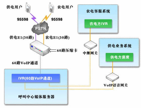 對于呼叫中心系統(tǒng),由95598特別號碼統(tǒng)一接入,并且在供電呼叫中心系統(tǒng)與農(nóng)電呼叫中心系統(tǒng)之間采用中繼方式(模擬中繼或者數(shù)字中繼,視農(nóng)電方實(shí)際情況而定)進(jìn)行話路連接,同時(shí)保證系統(tǒng)接入容量及其他資源能夠滿足統(tǒng)一的要求;在自動語音菜單中,分別設(shè)立供、農(nóng)電用戶層,用戶可以自行區(qū)分、選擇,對于農(nóng)電用戶在確定用戶類型之后,通過中繼將話路轉(zhuǎn)接到農(nóng)電方呼叫中心系統(tǒng)。