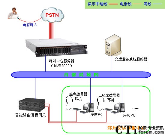 鄭州交運服務熱線采用暢信達通信MVB2000系統(tǒng)作為交換平臺,采用企業(yè)級智能路由語音網關結合話機作為座席終端,系統(tǒng)共接入數字中繼線4條(4E1),座席分機90臺,系統(tǒng)通過內部局域網組網,系統(tǒng)架構形式如下: