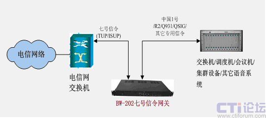 BW-202七號信令網(wǎng)關(guān)可實(shí)現(xiàn)多種信令方式與七號信令之間的互通。在當(dāng)前的電信網(wǎng)絡(luò)中,七號信令(SS7)系統(tǒng)已經(jīng)廣泛應(yīng)用,但很多傳統(tǒng)設(shè)備都還不具有七號信令接口,有些設(shè)備即使具有但也不標(biāo)準(zhǔn),BW-202七號信令網(wǎng)關(guān)能以最經(jīng)濟(jì)的方式幫助這些設(shè)備以標(biāo)準(zhǔn)的信令方式與七號信令設(shè)備連接, 其典型用法如圖所示: