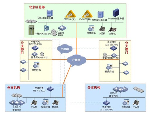 中心與各分部之間通過VOIP方式解決內(nèi)部通話問題,分部撥打北京區(qū)域的PSTN電話時(shí)從北京的中繼出局,節(jié)省了長途話費(fèi);北京的員工撥打分部的PSTN電話,從分部出局,如下圖: