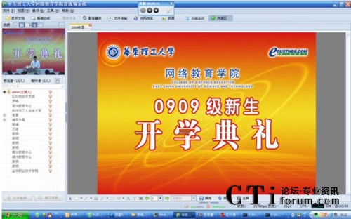 CTI論壇(ctiforum)9月30日消息:9月26日,華東理工大學(xué)網(wǎng)絡(luò)教育學(xué)院09級新生開學(xué)典禮上午9:00隆重舉行,主會場設(shè)在華東理工大學(xué)校本部(梅隴路130號)八教201室,并通過紅杉樹網(wǎng)絡(luò)視頻會議系統(tǒng)與校外各教育中心一起召開。