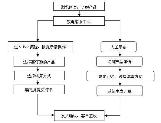 顧客的電話訂購(gòu)主要有兩種方式:一種方式為在購(gòu)物平臺(tái)400或800電話的IVR流程中根據(jù)提示語音來完成訂購(gòu)過程;另一種方式為人工服務(wù),客服人員幫助顧客完成訂購(gòu)過程。
