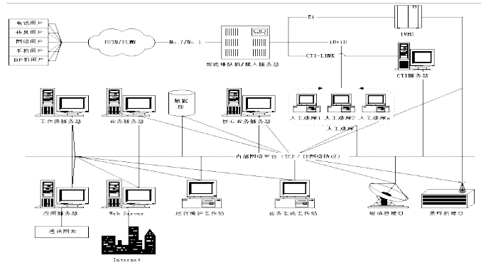 客戶服務中心系統包含智能排隊機(含接入服務器)、核心服務器CCS、交互式語音應答系統IVR、語音傳真服務器、業(yè)務服務器、工作流服務器、數據庫服務器、Internet/Intranet服務器、人工座席、尋呼機接口,手機短消息接口等組成。如下圖所示為Runsun呼叫中心系統結構圖: