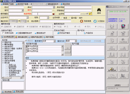 諾和關(guān)懷糖尿病服務(wù)中心的服務(wù)坐席可以實(shí)現(xiàn)患者信息的同步提示功能,當(dāng)電話被分配至坐席的同時(shí),患者的資料信息也同步出現(xiàn)在PC終端上。同時(shí)坐席終端可以自動(dòng)記錄對方的電話號(hào)碼,也可以實(shí)時(shí)顯示正在排隊(duì)等待的人數(shù),提示服務(wù)人員加快業(yè)務(wù)受理速度。