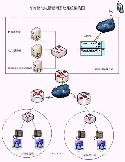 此次為電話(huà)營(yíng)銷(xiāo)系統(tǒng)一期工程,在省公司部署一套NBX V5000系統(tǒng)及相應(yīng)的CTI服務(wù)器,通過(guò)2條E1接入PSTN,在18個(gè)地市直接部署50個(gè)IP電話(huà)終端及坐席端軟件,語(yǔ)音走移動(dòng)已有的MDCN網(wǎng)絡(luò),一個(gè)集中受理分布處理的呼叫中心系統(tǒng)就建設(shè)起來(lái)啦,本次工程從設(shè)備到貨、系統(tǒng)上線(xiàn)試運(yùn)行,僅僅用了1個(gè)星期,我們海南移動(dòng)公司的項(xiàng)目經(jīng)理都驚訝的說(shuō)"太快啦啦,要是使用傳統(tǒng)的排隊(duì)機(jī)部署一個(gè)分布全省的類(lèi)似系統(tǒng),少說(shuō)工期也得幾個(gè)月"。經(jīng)過(guò)1個(gè)月的試運(yùn)行,系統(tǒng)運(yùn)行穩(wěn)定,各項(xiàng)系統(tǒng)指標(biāo)滿(mǎn)足合同要求,在11月份系統(tǒng)順利通過(guò)初驗(yàn)。