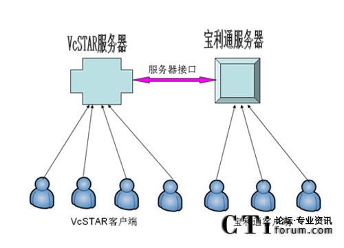 VcSTAR服務(wù)程序與寶利通系統(tǒng)進(jìn)行平臺對接,各系統(tǒng)客戶端聯(lián)接各自服務(wù)器系統(tǒng),聲音、圖像、文本等多媒體通過服務(wù)器間的接口互通。