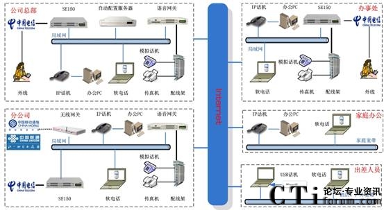 此方案適用于具有“移動(dòng)辦公、頻繁出差、家庭辦公”需求的企業(yè)。系統(tǒng)要求企業(yè)內(nèi)部部署好數(shù)據(jù)網(wǎng)絡(luò),如果采用模擬終端,則企業(yè)的各個(gè)辦公點(diǎn)需要先將網(wǎng)絡(luò)線路和電話線路部署到位。如果需要應(yīng)用WIFI終端,則需要部署WIFI網(wǎng)絡(luò)。