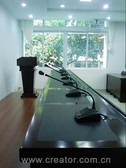 所以在本會(huì)議室配置了1臺(tái)標(biāo)準(zhǔn)的會(huì)議討論型控制主機(jī)臺(tái)CR-M4101,1臺(tái)座式的主席機(jī)CR-M4102B,9臺(tái)座式的會(huì)議代表機(jī)CR-M4104B,另外還有連接電纜等。主席機(jī)具優(yōu)先控制權(quán),設(shè)置主席位置,并且可以移動(dòng),代表機(jī)分別設(shè)置其余數(shù)個(gè)話筒點(diǎn)。采用手拉手方式,一條總線即可連接所有會(huì)議討論設(shè)備,布線簡(jiǎn)單快捷。通過專業(yè)的音頻輸出口和音響擴(kuò)聲系統(tǒng)結(jié)合,清晰、明亮的將發(fā)言人的聲音重放出來。