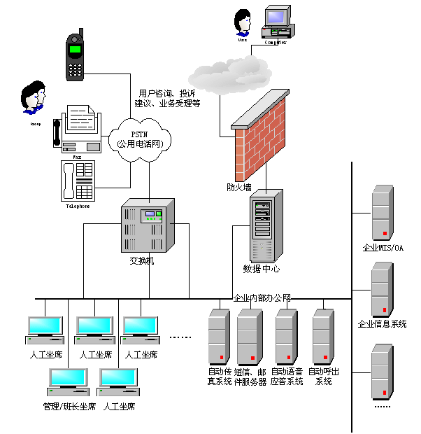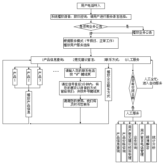 企業(yè)客戶服務(wù)中心系統(tǒng)功能介紹   通過電腦語音引導(dǎo),提示按鍵的方式,用戶通過電話、傳真等可自動(dòng)獲取企業(yè)的相關(guān)信息,如公司介紹、聯(lián)系方式、產(chǎn)品信息介紹等,以及對產(chǎn)品的投訴建議,留言,留聯(lián)系電話等;   對人工服務(wù)的電話請求采用多種分配策略。排隊(duì)用戶采用等待時(shí)間最長、用戶服務(wù)級(jí)別最高等策略。工作人員采用空閑時(shí)間最長優(yōu)先服務(wù),服務(wù)時(shí)間最短優(yōu)先服務(wù),以及技能服務(wù)等多種分配策略;   系統(tǒng)自動(dòng)獲取用戶的來電號(hào)碼,為企業(yè)提供主動(dòng)服務(wù)提供必要的聯(lián)系方式,獲取用戶的以往來電、人工接待處理記錄,掌握用戶信息、分析用戶狀況;   人工接通電話,坐席摘機(jī)后,系統(tǒng)自動(dòng)向用戶播放坐席工號(hào);   提供個(gè)性化的人工服務(wù),為用戶解答相關(guān)問題,業(yè)務(wù)受理,投訴建議受理,并可通過來電轉(zhuǎn)接(轉(zhuǎn)其他人工、轉(zhuǎn)外線)、三方通話等為用戶提供全方位的服務(wù);   實(shí)現(xiàn)坐席人員、班長、系統(tǒng)管理員等人員信息的增刪,權(quán)限管理,技能分組, 服務(wù)模式設(shè)定等;   實(shí)現(xiàn)用戶自動(dòng)服務(wù)的留言、傳真,以及人工服務(wù)全程錄音的查詢、回放、瀏覽;   用戶電話的自動(dòng)/人工呼出,自動(dòng)播放企業(yè)相關(guān)信息,為用戶提供企業(yè)的主動(dòng)服務(wù)。系統(tǒng)自動(dòng)呼出可設(shè)定呼出用戶電話、呼出時(shí)間(段)、呼出失敗次數(shù)、自動(dòng)播放的語音等。并記錄呼出成功的時(shí)間、人工服務(wù)的通話時(shí)間、以及通話的全程錄音等;     系統(tǒng)可通過手機(jī)短信、Email 等方式發(fā)布企業(yè)的相關(guān)信息,以及通知用戶;     提供必要的統(tǒng)計(jì)分析、報(bào)表打印,獲取產(chǎn)品的市場反饋,以及系統(tǒng)話務(wù)量、人 工服務(wù)質(zhì)量,客戶反饋信息、人工工作、回訪成功、失敗率等的分析;      包括安全管理(密碼系統(tǒng)、確認(rèn)系統(tǒng)等)、平臺(tái)管理(如網(wǎng)絡(luò)管理、主機(jī)管理、數(shù)據(jù)備份等)。
