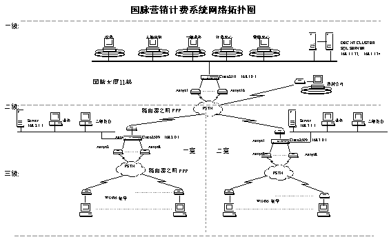 一級為計費中心,位于國脈大廈內(nèi),作為整個系統(tǒng)的運行中心和數(shù)據(jù)中心,也是整個系統(tǒng)的樞紐。二級主要位于二個營業(yè)室,是整個系統(tǒng)的分中心。三級為各營業(yè)所和代銷點,分散在全市各處是整個系統(tǒng)的數(shù)據(jù)基礎。