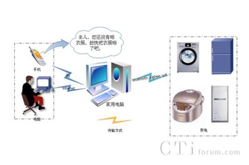 家電遠(yuǎn)控系統(tǒng)的原理是利用電腦或者手機(jī)的電源管理系統(tǒng),來管理用戶終端軟件管理電源的開關(guān)、定時(shí)、預(yù)設(shè)時(shí)間等,利用互聯(lián)網(wǎng)或者手機(jī)網(wǎng)絡(luò)把信號傳輸?shù)郊彝ル娔X,家庭電腦當(dāng)作小型服務(wù)器或者信號轉(zhuǎn)發(fā)點(diǎn),把信號利用藍(lán)牙、zigbee、wifi等無線傳輸?shù)街付ǖ碾娫床遄,?dāng)然每個(gè)電源插座都要有相應(yīng)的信號接收模塊實(shí)現(xiàn)和家庭電腦的信號傳輸,實(shí)現(xiàn)了對電源的管理功能。家電遠(yuǎn)控終端軟件嵌入語音合成軟件,利用合成語音報(bào)讀預(yù)設(shè)的提醒內(nèi)容和時(shí)間提醒,具有危急情況下的報(bào)警功能。當(dāng)然如果我們是在家里,可以直接用手機(jī)通過藍(lán)牙對電源插座進(jìn)行管理,或者通過家庭電腦進(jìn)行管理。如圖所示: