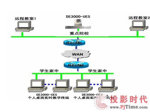 如上圖所示:DE3000系列中的DE3000-CES(個(gè)人桌面實(shí)時(shí)教學(xué)終端)主要用于學(xué)生在家里的PC上與學(xué)校的老師進(jìn)行實(shí)時(shí)的面對(duì)面授課。在學(xué)校的多媒體教室配備DE3000-UES(遠(yuǎn)程教育終端設(shè)備),在學(xué)生家中的電腦上安裝DE3000-CES(個(gè)人桌面實(shí)時(shí)教學(xué)終端),即可實(shí)現(xiàn)遠(yuǎn)程實(shí)時(shí)授課,其高質(zhì)量的音視頻效果與強(qiáng)大的數(shù)據(jù)功能,使學(xué)生猶如坐在教室里上課一樣,可體現(xiàn)出強(qiáng)烈現(xiàn)場感。
