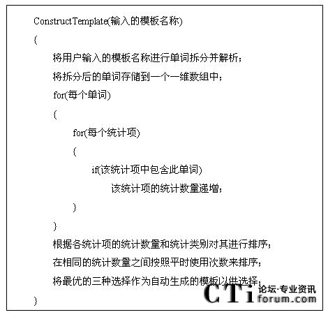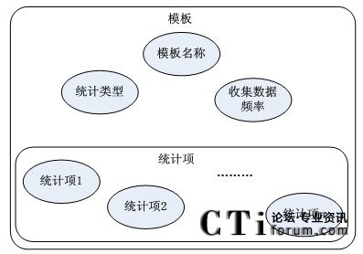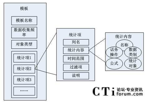 由模板結構框架圖得知,模板包括模板名稱,數(shù)據(jù)統(tǒng)計對象,收集數(shù)據(jù)的頻率和多個基本統(tǒng)計項。其中,每個統(tǒng)計項對應著統(tǒng)計對象(如:坐席,路由點等)的一條統(tǒng)計內(nèi)容信息(如:1小時內(nèi)的呼叫總量等)。然后由這些統(tǒng)計項和統(tǒng)計參數(shù)組合成模板,從而構成對呼叫中心對象的統(tǒng)計信息。