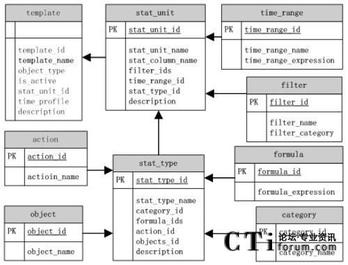 在模板配置存儲模型圖中,分別建立了單獨的表對模板劃分的每一個基本對象進行儲存。表template存儲模板的配置信息,stat_unit表存儲了統(tǒng)計項的基本信息,stat_type表是一些有關模板具體內(nèi)容的配置。各表之間通過各自的ID標識號來進行關聯(lián)。不過一個模板可以包括多個統(tǒng)計單元,一個統(tǒng)計項可以包含多個過濾項,一個統(tǒng)計內(nèi)容可以包含多個公式,這樣他們之間的ID關聯(lián)就成為1對多的關系。在這種情況下,父項中的ID關聯(lián)多個子項ID,其間是用逗號分隔。