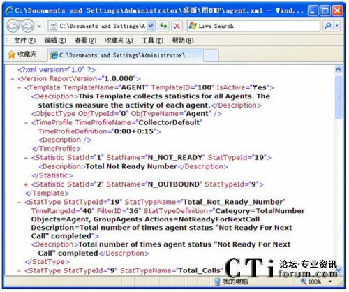 在模板導出的XML儲存圖中,ReportVersion屬性為報表系統(tǒng)的版本號。Template信息用來指定一個模板名字,給模板一個唯一的模板ID,再指定該模板是否激活,另外也為該模板添加了注釋。該例中是對所有坐席活動的數(shù)據(jù)進行統(tǒng)計。ObjectType為模板的統(tǒng)計類型,該模板中統(tǒng)計類型為坐席(Agent)。TimeProfile為設定收集的時間間隔,本例中為從每天的0點0分開始,每隔15分鐘收集一次。Statistic對應了一個統(tǒng)計內(nèi)容配置,根據(jù)StatTypeID在下面將列出詳細內(nèi)容。本例中StatTypeID為19,下面的StatType中將會根據(jù)StatTypeID與之相對應,其中配置了Category,