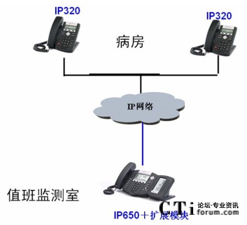 病房的IP550話機可以設(shè)置成摘機直通值班室的熱線模式,病房只要拿起聽筒,電話自動接通值班室,無需撥號。如果需要,病房同樣也可將IP550上設(shè)置成一鍵通話模式,定義值班室的快速通話按鍵,出現(xiàn)問題時一鍵接通值班室。