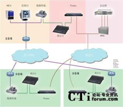 VORTEX 2241或2211與中心會場的調(diào)音臺聯(lián)結(jié)),在每個分會場根據(jù)會議規(guī)模分別配備一套POLYCOM會議電話根據(jù)會場數(shù)量配備一套相應方數(shù)的PSTN音頻會議橋。