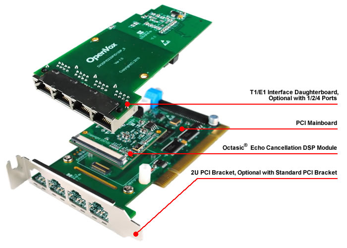 升級版的T1/E1卡可適合于2U機(jī)箱。32位33MHz PCI設(shè)計(jì),完全兼容2.3規(guī)格的PCI插槽,自動檢測和識別5V和3.3V PCI主板。先進(jìn)的FPGA設(shè)計(jì),能在線升級固件,硬件和軟件的升級更新使用更方便。Octasic DSP硬件回聲消除模塊可使每個(gè)通道消除回音尾音高達(dá)128ms或者1024taps,極大得提高了語音質(zhì)量,又不會增加CPU負(fù)載。