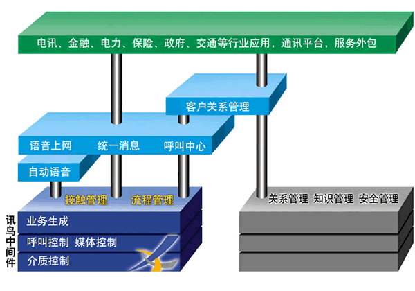 而要支撐這些復(fù)雜的應(yīng)用,中間件應(yīng)該可以進(jìn)行接觸管理、流程管理。和目前已有的關(guān)系管理、知識(shí)管理、安全管理結(jié)合,可以全方位的支撐應(yīng)用系統(tǒng)。訊鳥中間件就是這樣的中間件,它是建立在分布式計(jì)算環(huán)境上,可以控制多種通訊設(shè)備,支撐生成多種業(yè)務(wù)應(yīng)用軟件的軟件。它可以支持語(yǔ)音網(wǎng)的交互,因特網(wǎng)的交互,支持呼叫和數(shù)據(jù)的同步傳輸。它支持工作流程的生成,而不用了解一個(gè)工作流程是如何在不同的設(shè)備上運(yùn)行。同時(shí),它的業(yè)務(wù)描述語(yǔ)言是用中文和圖標(biāo)表達(dá),易于和業(yè)務(wù)接軌,方便系統(tǒng)集成商、最終客戶,給系統(tǒng)分析員提供優(yōu)秀的設(shè)計(jì)工具和運(yùn)行平臺(tái),極大提高了工程的實(shí)施效率。