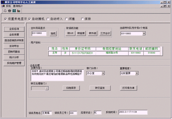 客戶打入電話后,當(dāng)系統(tǒng)的自動(dòng)語(yǔ)音應(yīng)答子系統(tǒng)無(wú)法解決客戶問(wèn)題時(shí),客戶可選擇人工服務(wù),由企業(yè)客戶服務(wù)代表直接接聽(tīng)客戶電話,處理并解決客戶問(wèn)題。此時(shí)客戶同座席話務(wù)人員直接溝通,并同時(shí)記錄下該客戶的聯(lián)系方式,將相關(guān)數(shù)據(jù)添加入系統(tǒng)數(shù)據(jù)庫(kù);也可以在數(shù)據(jù)庫(kù)的支持下回答接受查詢卷煙/價(jià)格/限額/新品種、卷煙經(jīng)營(yíng)規(guī)范制度/卷煙專(zhuān)賣(mài)政策法規(guī)咨詢、通報(bào)最近暢銷(xiāo)卷煙的限額情況/通報(bào)最近增加的新品種/煙草公司召集的活動(dòng)通知、投訴和舉報(bào)違法經(jīng)銷(xiāo)行為、卷煙預(yù)訂、電話訪銷(xiāo)、滿意度調(diào)查等。